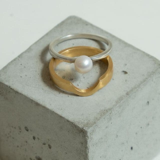 シルバー925と、K18メッキの2連リング。シルバーとゴールドのカラーは華やかにもエレガントにも。地金を真鍮に変えてのオーダーも可、プラチナ/ゴールドに変えてのオーダー可(別途見積もり)。